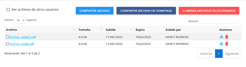 - Hacer "clic" en los íconos correspondientes a Compartir Archivo o Eliminar Archivos Seleccionados, según la acción requerida.