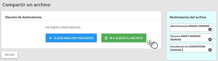 - Una vez completos todos los destinatarios, hacer "clic" en la opción Ir a Elegir el Archivo.
