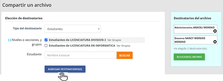 - Realizar la búsqueda y seleccionar el o los destinatarios a los que se desea dirigir el Archivo.