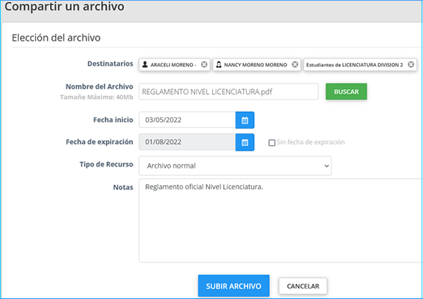 - Fecha de Expiración. (Nota: La fecha de expiración no podrá ser seleccionada, el tiempo de expiración de un archivo es configurado por el Administrador del Sistema en Preferencias de Operación).
