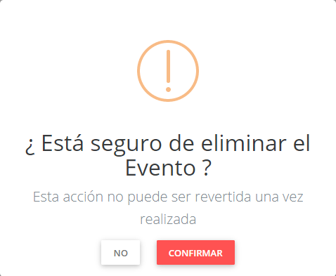 - Ubicar el evento que se va eliminar dando clic en el icono de color rojo (contenedor de basura), que se encuentra en la tabla de acciones.