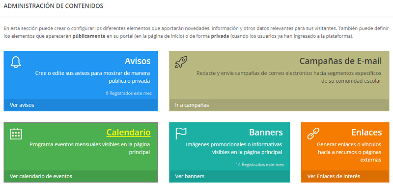 Al ingresar a plataforma como usuario de tipo Administrador, se podrá programar eventos mensuales visibles en la página principal.