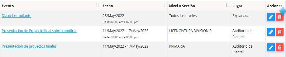 - Se mostrará el listado de los eventos que se dieron de alta.