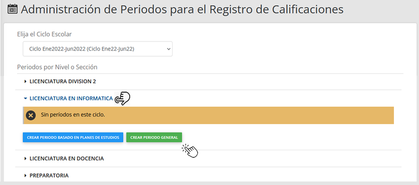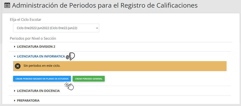 - Hacer "clic" en la opción [Crear Periodo basado en planes de Estudio].