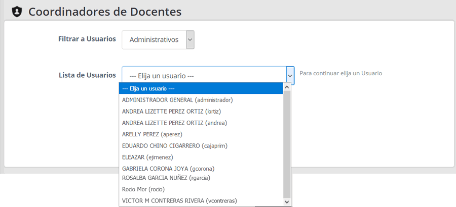 - Seleccione un usuario para asignarle o removerle Docentes, para ello filtre por su perfil (Administrativo o Docente), y de la 'Lista de Usuarios' seleccione uno.
