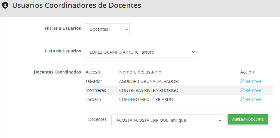 - Para desvincular (suprimir) un docente de su coordinador, de la lista de docentes asignados, haga clic en 'Remover'.