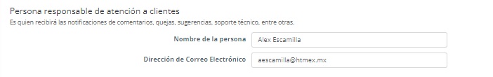 - Agregue el Nombre de la persona que recibirá correos electrónicos de la plataforma para el seguimiento de atención a clientes.