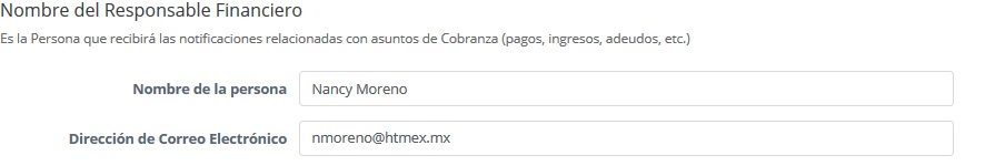 - Agregar el nombre y correo electrónico de la persona que recibirá las confirmaciones de pagos en línea y asuntos relacionados con cobranza.