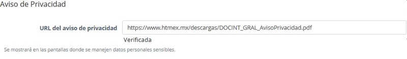 - Registrar la URL del archivo que contiene el aviso de privacidad, esta dirección se mostrará en pantallas donde se maneja datos sensibles.