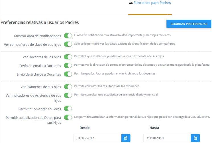 Esta opción permitirá al usuario Administrador configurar el contenido que visualizará los Usuarios Padres en la página principal y en funciones para quien use APP iOS y Android de la plataforma Web.