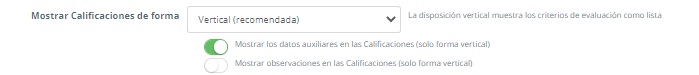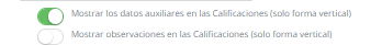 También el usuario podrá activar la opción para visualizar los datos auxiliares en las calificaciones (solo forma vertical), además de activar la opción mostrar observaciones en las calificaciones de forma vertical: