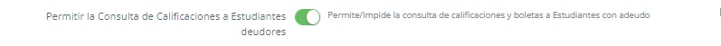 - Activar la opción Permitir la Consulta de Calificaciones a Estudiantes deudores.