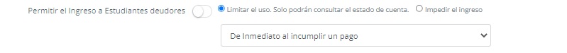 Si se desea impedir el ingreso a la aplicación a Estudiantes con adeudo desactive la opción e indique el lapso de tiempo que debe transcurrir una vez identificado el adeudo.