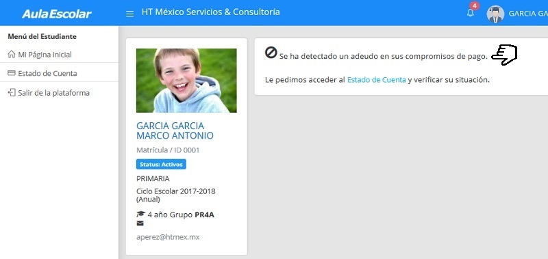Al intentar ingresar el Estudiante a la plataforma se mostrará el mensaje Se ha detectado un adeudo en sus compromisos de pago.