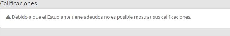 Si no se activa esta opción cuando el usuario estudiante ingrese a consultar sus calificaciones en la plataforma se mostrará el mensaje Debido a que el Estudiante tiene adeudos no es posible mostrar sus calificaciones.