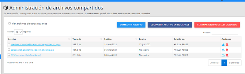 Nota: Máximo permitido 90 días. (el webmaster podrá visualizar los archivos de todos los usuarios)