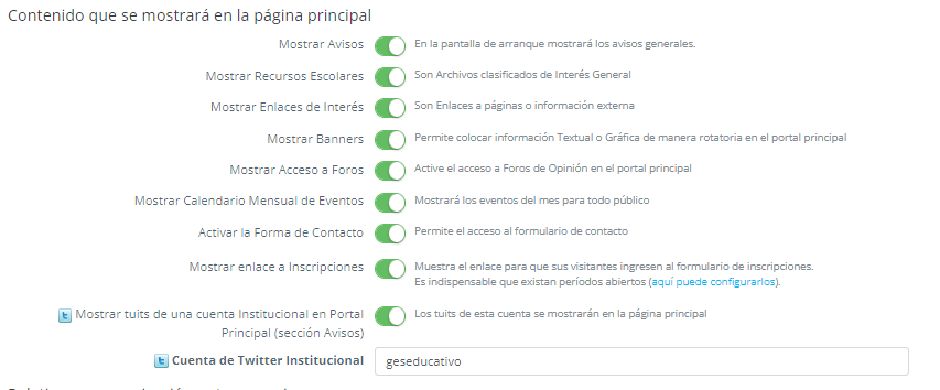 Esta opción permitirá al usuario administrador configurar el contenido que se visualizará en la página principal de la plataforma.