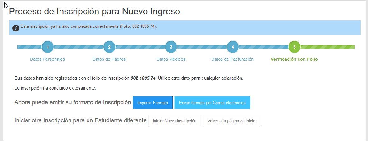 - Al terminar de llenar todos los datos requeridos(Personales, Padres, Médico, Facturación) le aparecerá un folio y el mensaje de que ha concluido exitosamente. De igual manera tendrá dos botones disponibles uno para imprimir el formato y otro para enviarlo por correo electrónico.