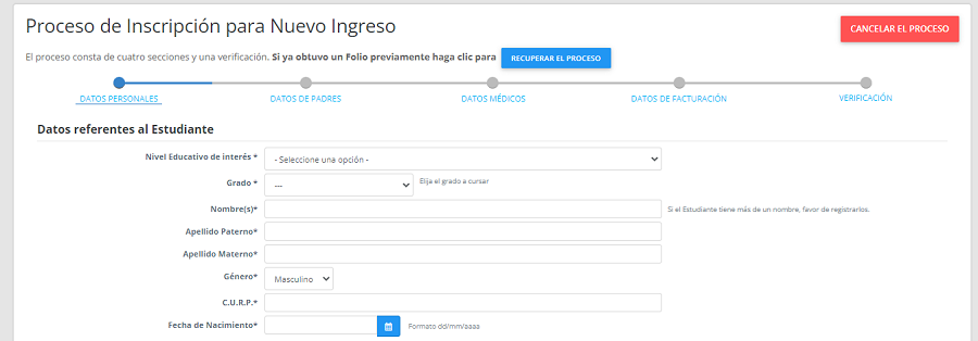 - Al hacer "clic" en el icono de proceso de inscripciones se mostrará el formulario a llenar con los datos del alumno como se muestra a continuación
