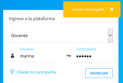 Esta opción activará en pantalla el mensaje El acceso está restringido al Usuario Docente al intentar ingresar a la plataforma fuera del horario establecido.