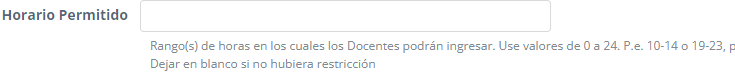 Nota: El rango(s) de horas en los cuales los Docentes podrán ingresar. Use valores de 0-24. Ejemplo: 10-14 o 19-23, puede usar varios rangos usando una coma como separador. Deje en blanco sino hubiera restricción.