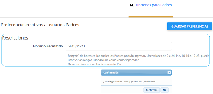 Esta opción activará en pantalla el mensaje Acceso restringido al Usuario Padre al intentar ingresar a la plataforma Web fuera del horario establecido.
