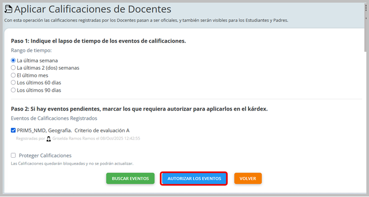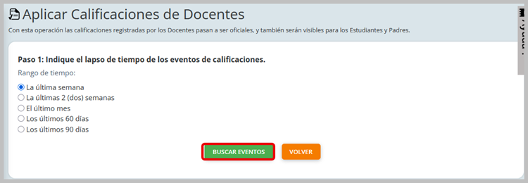 Para aplicar las Calificaciones de docentes inice con el paso 1 que corresponde con indicar el lapso de tiempo de acuerdo con el rango de tiempo y hacer clic en el botón buscar eventos.