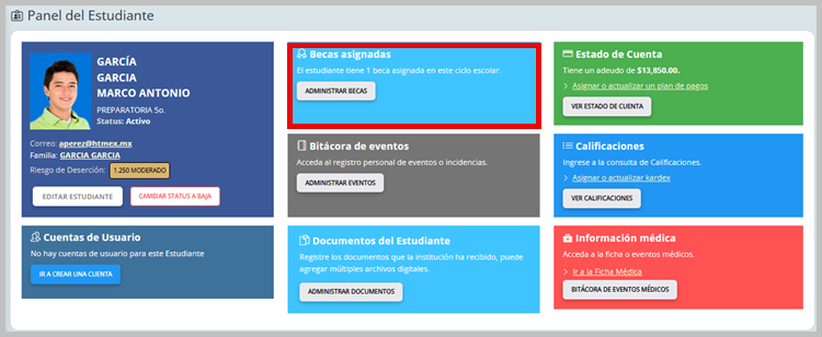 En el panel del Estudiante está disponible la opción Administrar Becas: