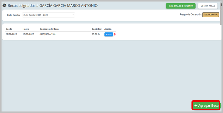 Para agregar iniciar el proceso de asignación de beca para el estudiante se debe hacer clic en el botón + Agregar Beca.