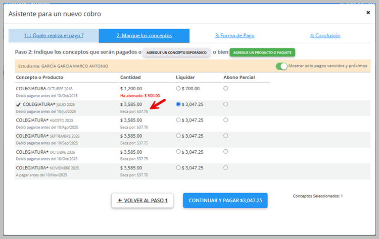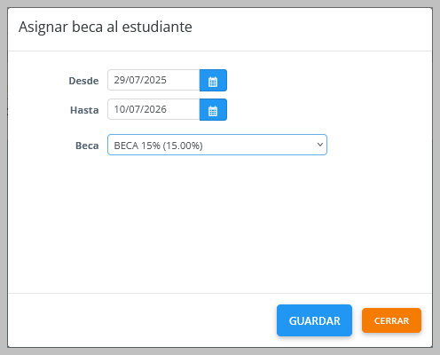 Durante el proceso de registro de cobros la plataforma hará el calculo del descuento de la beca.