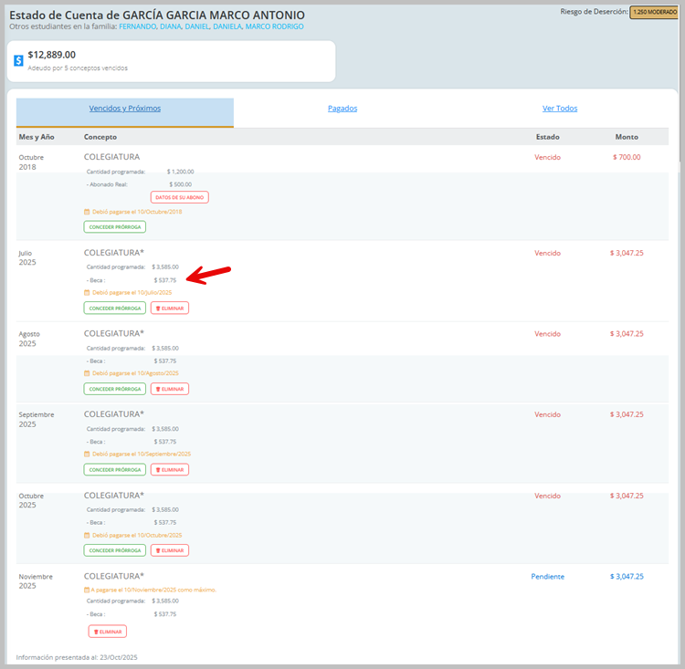 Una vez asignada se visualizará el descuento de becas en el Estado de Cuenta.