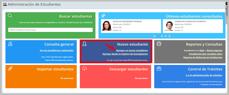 En la administración de estudiantes está la opción Agregar un nuevo estudiante.