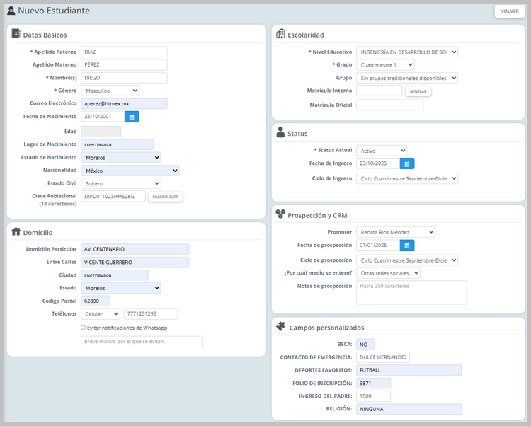 Se mostrará un formulario con diferentes apartados: Datos Básicos, Domicilio, Escolaridad, Status, Prospección y CRM finalizando, para comenzar el proceso de registro se deben registrar los datos del nuevo estudiante,