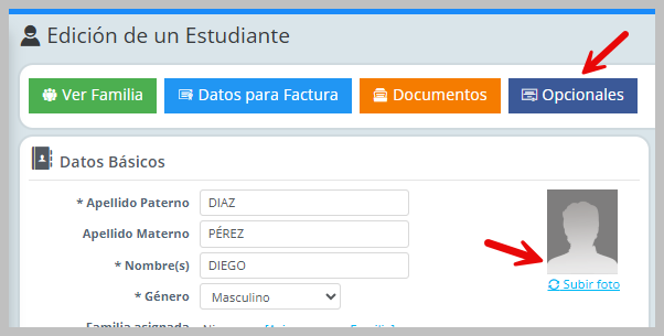 Al guardar los datos capturados de primer momento, se habilitará la opción para subir la fotografía del Estudiante,