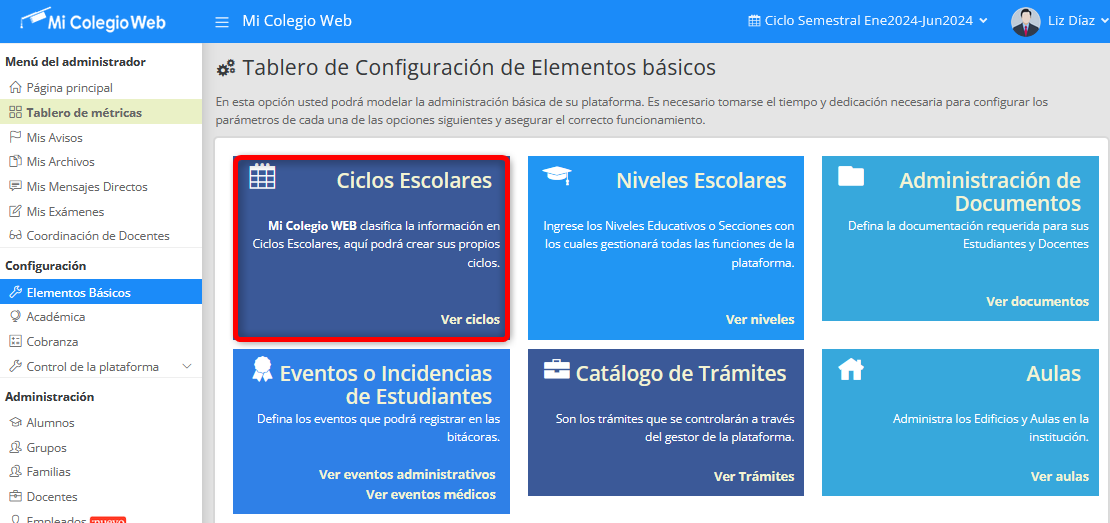 * En el Menú del Administrador en el submenú de Configuración entramos a Elementos Básicos, ubicando el módulo de Ciclos Escolares.