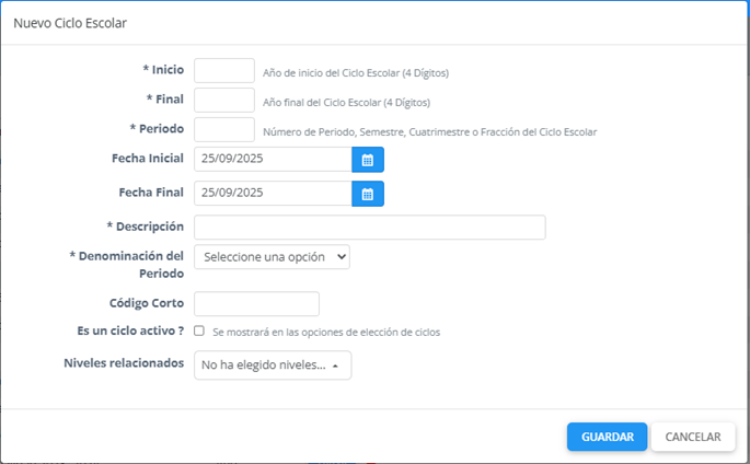 Para crearlo vamos a dar "clic" en la opción “Nuevo Ciclo Escolar”. Capturando cada uno de los campos, así como definir si el Ciclo