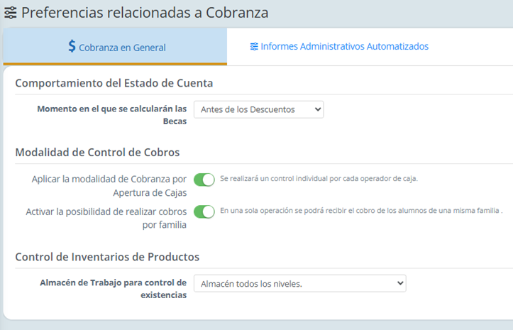 Aplicar la modalidad de Cobranza por Apertura de Cajas: Permite controlar los cobros que realizará un usuario en una caja específica. Próximamente Activar la posibilidad de realizar cobros por familia: Te facilitará realizar el cobro en una sola operación de más de un alumno que pertenezcan a una familia. |