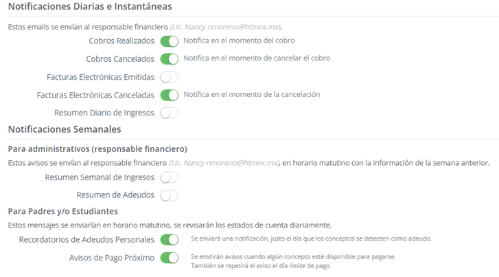 Para Administrativos(responsable financiero): Resumen semanal de ingresos y Resumen de Adeudos. Para Padres y/o Estudiantes Recordatorios de Adeudos Personales: Activar la notificación de recordatorio de Adeudos que al momento tenga pendiente cada Estudiante. Avisos de Pago Próximo: Activar la notificación de recordatario del próximo pago para evitar atrasos en pagos. |