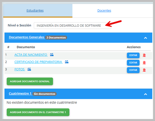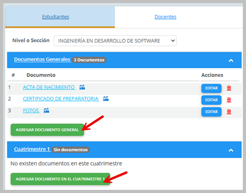 Seleccione el apartado en el que dará de alta el documento: estudiantes o docentes.