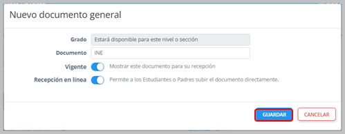 Posteriormente, se debe definir si el documento será general, es decir, aquellos que se solicitan al momento de la incorporación del alumno a la institución, o por grado, los cuales se van actualizando conforme avanza cada ciclo escolar.