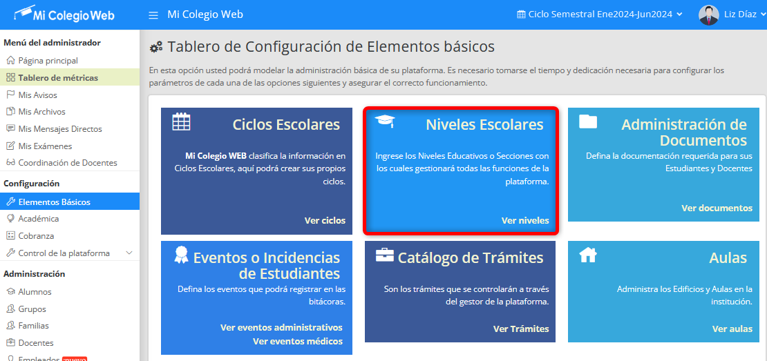 En la plataforma de Mi Colegio Web, los niveles escolares se organizan de manera progresiva, representando cada etapa del proceso educativo.