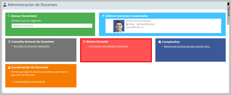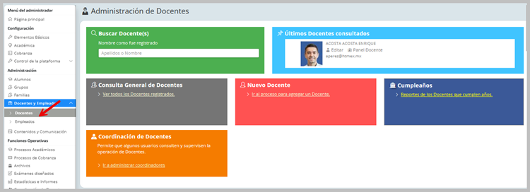 Para comenzar la administración general de docentes, debe hacer clic en la opción Docentes que está en el submenú Docentes y empleados.