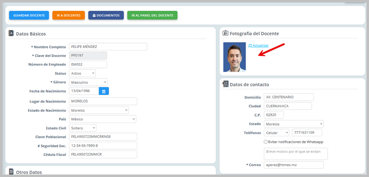 Automáticamente se llena el dato Clave del Docente, este dato es autogenerado con el prefijo PF y puede ser editado si la institución así lo requiere. |
