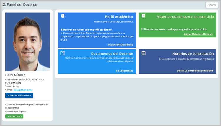 En esta sección podrá continuar configurando el perfil académico, los documentos, la carga académica y horario contratado.