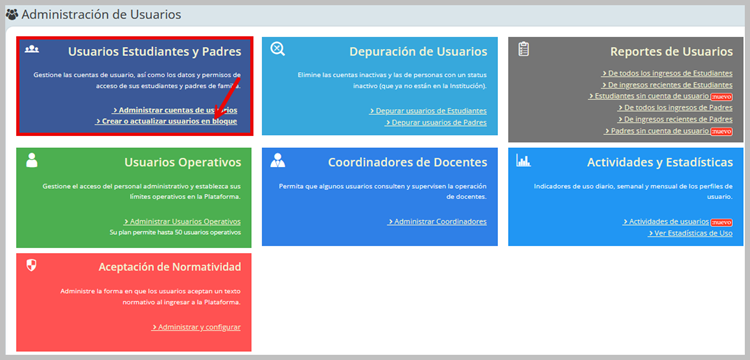 El usuario administrador puede crear las cuentas de los Estudiantes y Padres de forma masiva en esta sección de administración de usuarios disponible el enlace >Crear o actualizar usuarios en bloque: