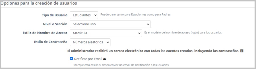 - Seleccionar el Tipo de Usuario que se desean crear (Estudiante o Padre).