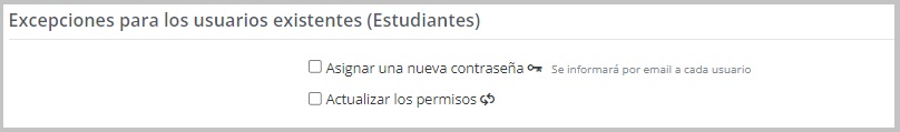 - Activar las casillas Asignar una nueva contraseña y Actualizar los permisos si se requieren hacer excepciones para los usuarios existentes (Estudiantes).