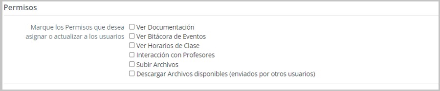 - Marque las casillas de los Permisos que desea asignar o actualizar a los usuarios.