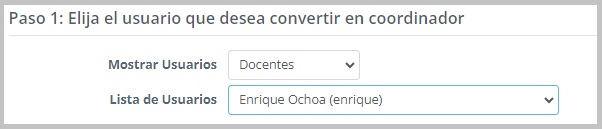 En la administración de usuarios coordinadores de Docentes se inicia con el paso 1 que corresponde con elegir el usuario que desea convertir en coordinador: