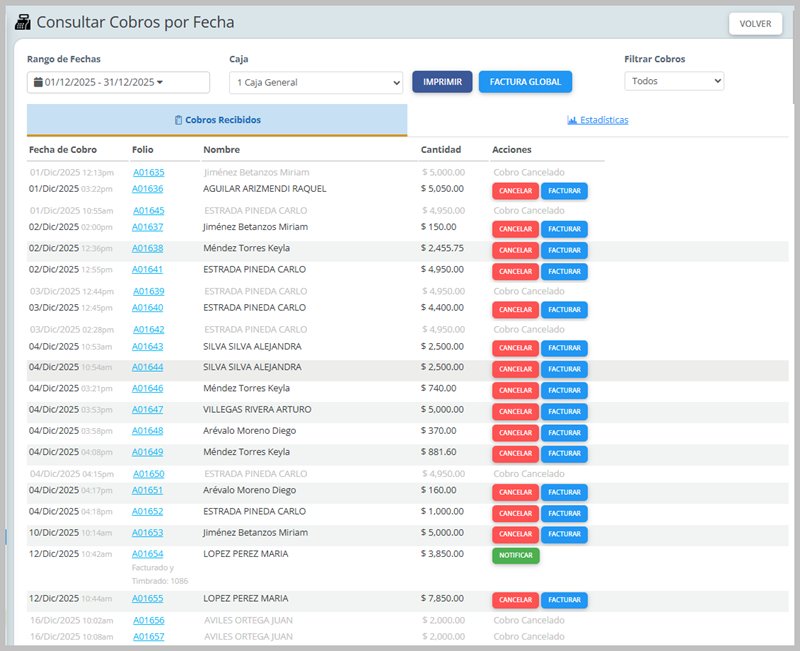 - Facturar: Emitir la factura si no fue generada después del registro de cobro.